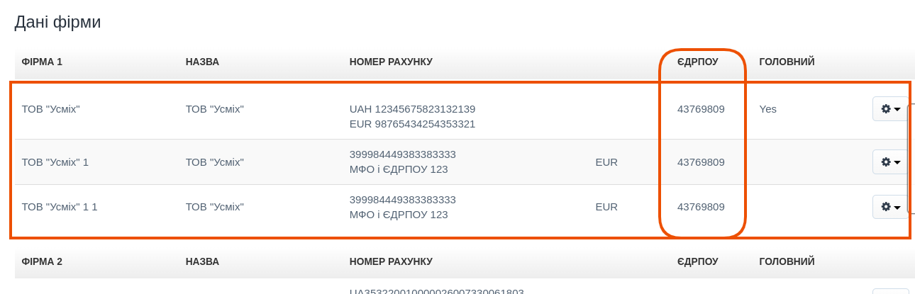 Окремим відділом у фірмі може бути, наприклад, окрема локація, окремий банківський рахунок або окремий магазин, якщо ви керуєте більше ніж одним. Це також чудове рішення, якщо ви продаєте свої товари іноземною мовою або в іншій валюті — можна створити окремий відділ для рахунків-фактур німецькою мовою та окремий для рахунків іспанською. У списку у закладці "Дані фірми" відділи будуть згруповані за кодом ІПН/ЄДРПОУ.
