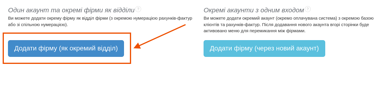 Підчас додавання фірми чи відділу під одним акаунтом, клієнти та продукти є спільними. В кожному акаунті можна додавати будь-яку кількість окремих відділів, тоді як окремі фірми в одному акаунті можна додавати користуючись планом Standard.