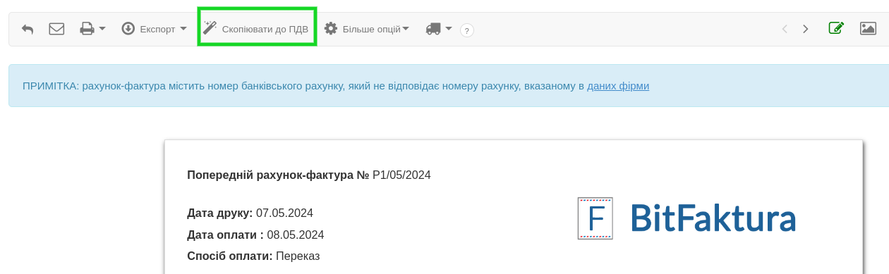 Безпосередньо з створеного в системі Рахунка-проформи ви можете виставити рахунок-фактуру.