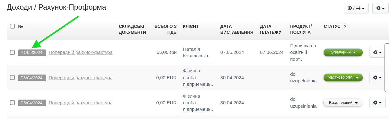 - зайдіть у перегляд рахунка-проформи, натиснувши на його номер – список рахунків доступний після натискання на Доходи > Рахунки-проформа;