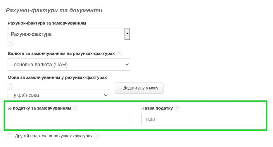 BitFaktura дозволяє налаштовувати назву та ставку податку, який ви використовуєте. Основну ставку податку та назву податку можна визначити в меню Налаштування > Налаштування акаунта > Конфігурація > % податку за замовчуванням та Назва податку.