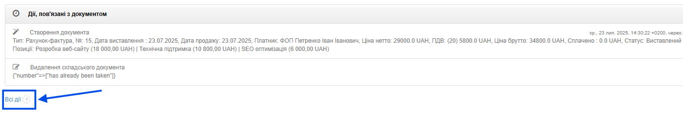До закладки з активностями можна перейти також безпосередньо з рівня кожного виставленого документа в системі. У перегляді рахунку-фактури, під документом, є розділ Дії, пов'язані з документом, де ви знайдете дії, що стосуються саме цього документа. Під цим списком доступна фраза всі дії. Якщо натиснути на неї, система перенесе вас до повного списку активностей, тобто на закладку Налаштування > Активності.