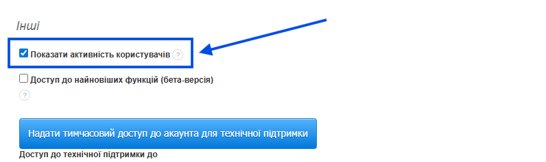 - Пролистайте сторінку вниз до розділу Інші та позначте прапорець біля опції Показувати активності користувачів,